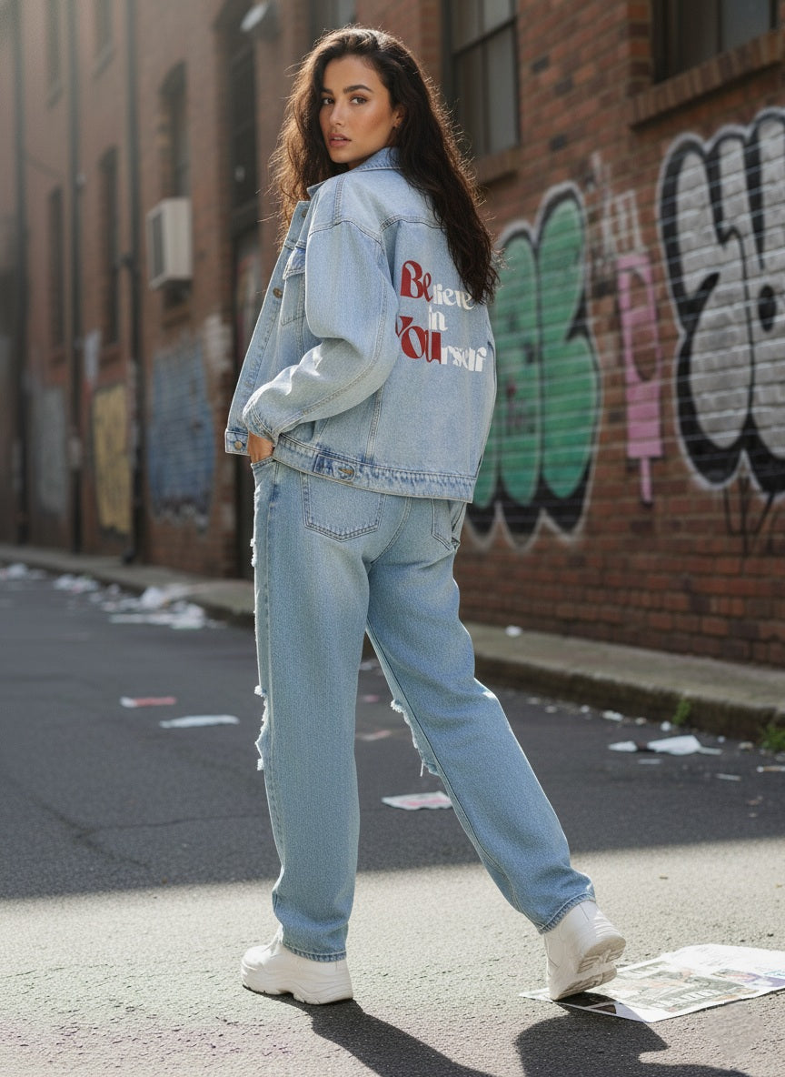Diese Jeansjacke ist für dich, wenn du nicht nur Kleidung trägst, sondern eine Haltung lebst. Sie ist für Macher, die ihre Ziele mit Willenskraft verfolgen und dabei ihren eigenen Stil leben. Trag sie und zeig der Welt, dass deine Reise voller Selbstvertrauen und Stärke ist.