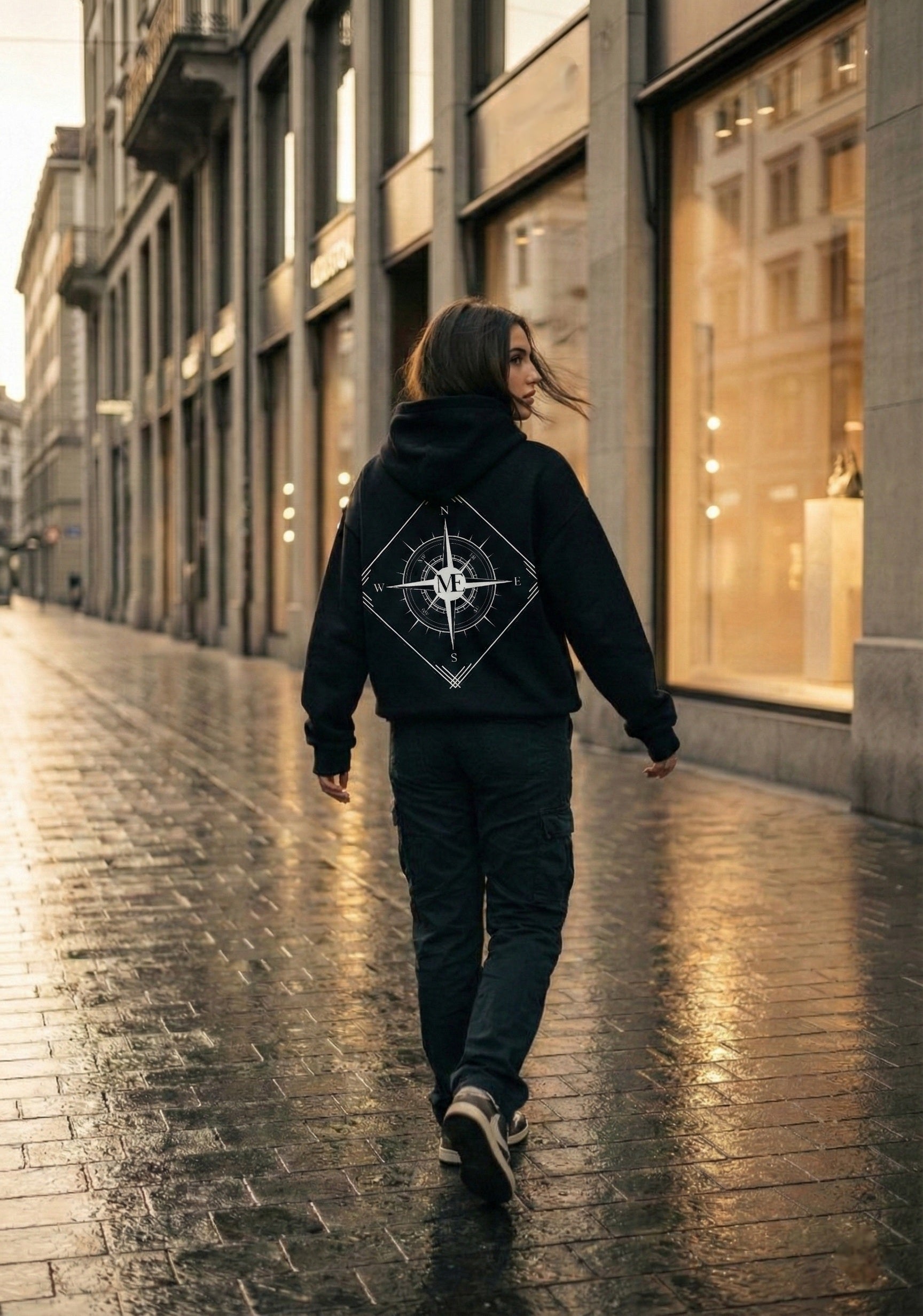 Ein Statement-Piece mit Bedeutung – der Navigate Life Hoodie verbindet minimalistischen Streetstyle mit künstlerischem Ausdruck.